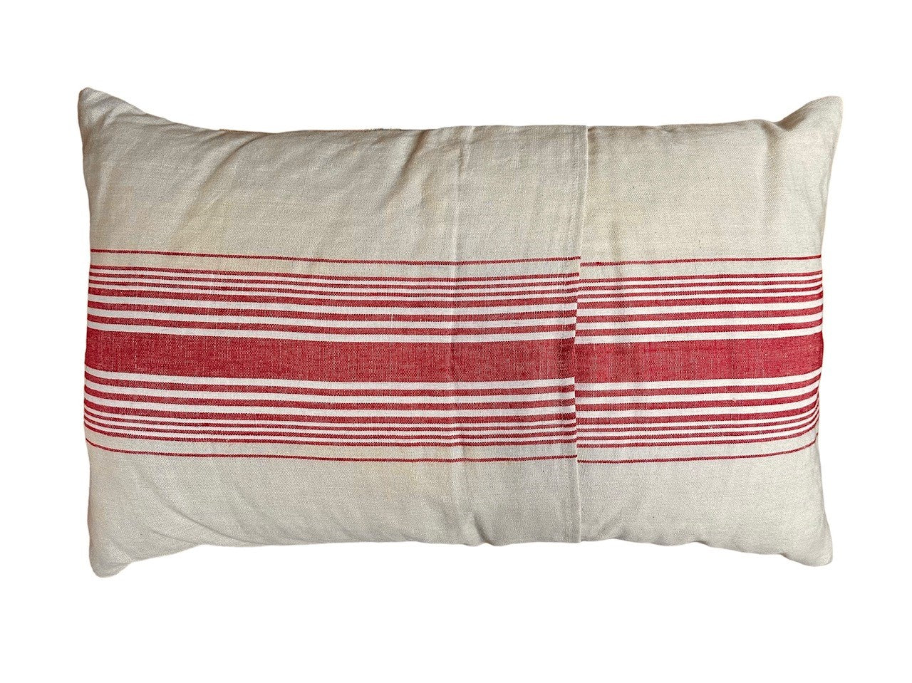 It might be unfinished, but this vintage wool tapestry has an aging charm. With its traditional red and natural striped ticking back, this NZ/Australian standard pillow sized cushion (L 73cm x W 48cm) is made for relaxing.